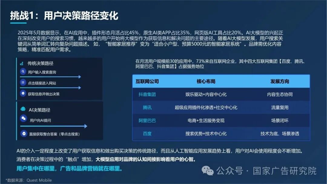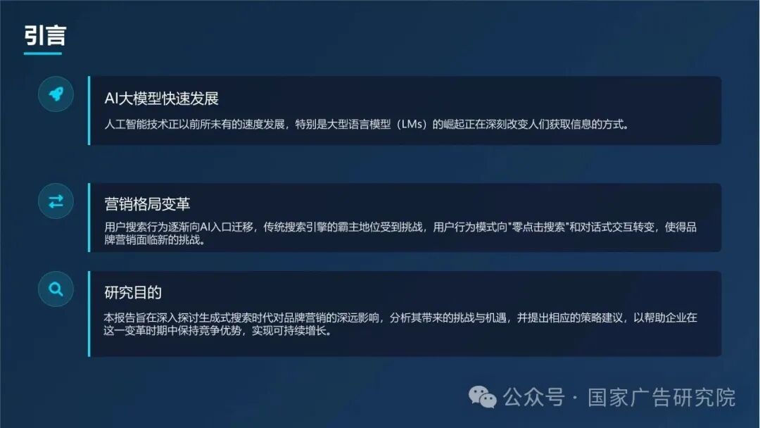 当越来越多的用户将大模型作为信息获取的首选渠道,品牌曝光和传播的场域也出现了新的变化。精准提问正在取代传统关键词,从“买品类”向“买场景解决方案”转变。这一变化,无疑也给品牌的曝光和传播带来了新的机遇和挑战。“预则立,不预则废”。国家广告研究院推出报告《基于“搜索”功能的生成式大模型带来的品牌传播机会与挑战》,深入分析这一话题,助力企业在变革时期保持竞争优势,实现可持续增长。