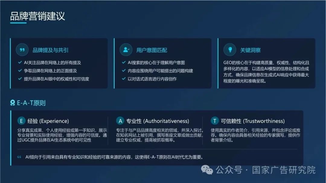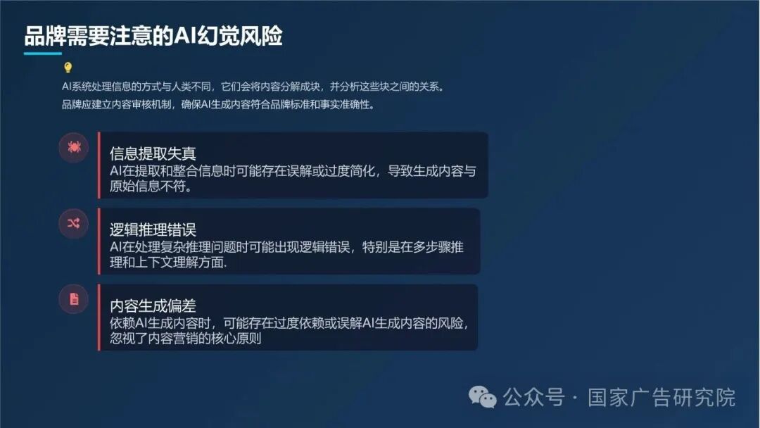 对消费者来说,向大模型提问能够提升决策效率,但对品牌而言,各个渠道的信息直接被大模型整合成面向用户的回答,传统搜索引擎广告的竞价露出转化为能否优先被大模型作为参考来源。品牌之间的竞争并没有消失,而是在算法的笼罩下变得更加隐蔽和难以操控。 生成式引擎优化(GEO)已成为品牌竞争新赛道,核心重点就是对 AI 答案中的“被提及率”与“推荐权重”的争夺。同时也应意识到当前阶段难以完全消除的AI幻觉,如错误描述产品参数给品牌公关带来的潜在隐患。企业需尽早布局大模型可能引用的参考来源,并确保内容的准确,具体可从三方面着手:一是强化权威内容建设,增加官网、专业测评被 AI 抓取的概率;二是深耕场景化内容创作,围绕用户高频场景化需求构建内容,提高与用户提问的匹配度;三是建立 AI 内容审核机制,防范 “信息失真” 与竞品恶意诋毁,避免 AI 幻觉引发的品牌信任危机。